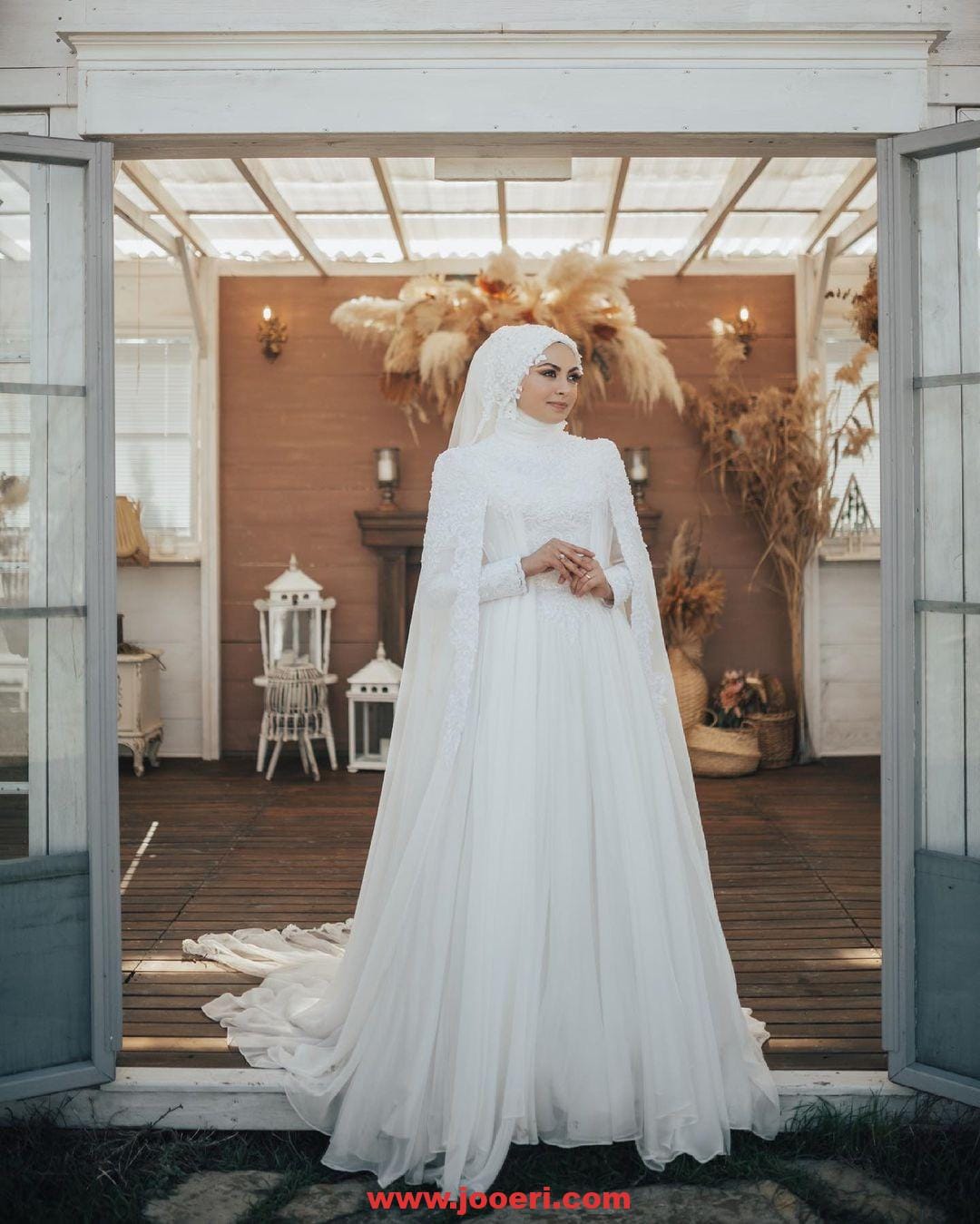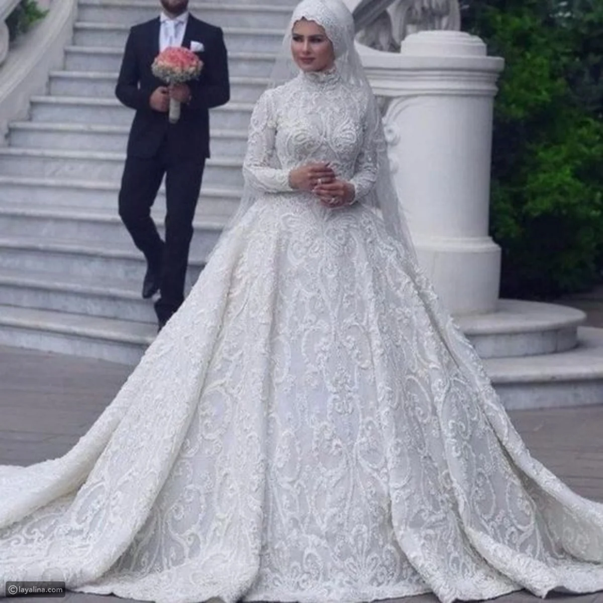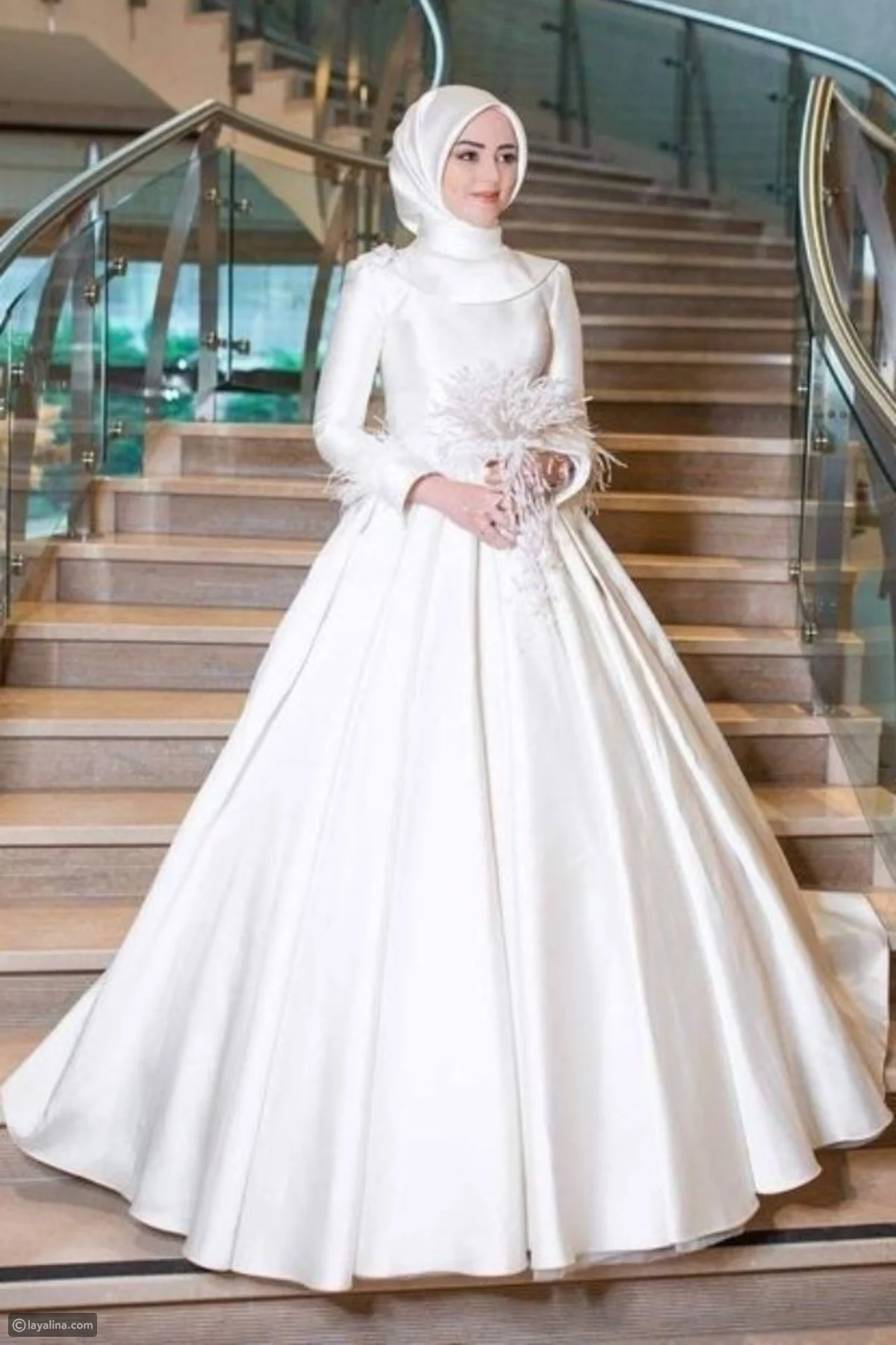 إذا كُنت ترغبين في إطلالة كالملكات في يومك المميز، يمكنك ارتداء فستان الحرير الواسع الذي يعتبر جزءًا من مجموعة فساتين الأعراس للمحجبات، صُمم هذا الفستان من الحرير الأبيض الرقيق بتصميم هادئ وأنيق، ويمكنك اختيار تطريز الدانتيل الهادئ لإضافة لمسة جمالية إلى الفستان، يتميز التصميم بأكمام طويلة ومنفوخة من الكتف، وقصة ضيقة في الوسط، وتنورة واسعة ومنفوشة تصل إلى الأرض بشكل أنيق، ويمكن تنسيق الفستان مع حجاب شيفون طويل من نفس لون الفستان وبوكيه ورد يدويًا.