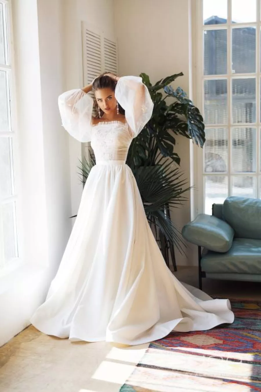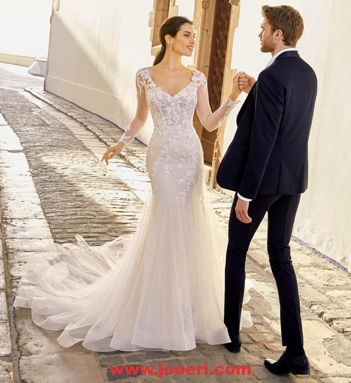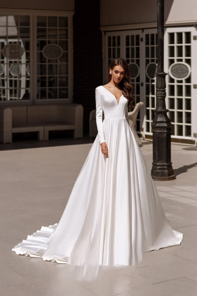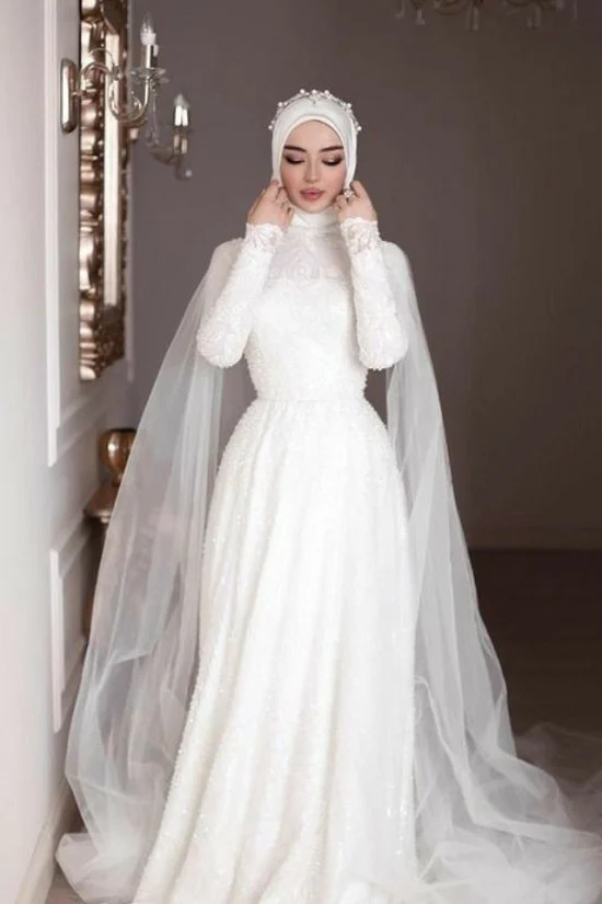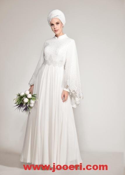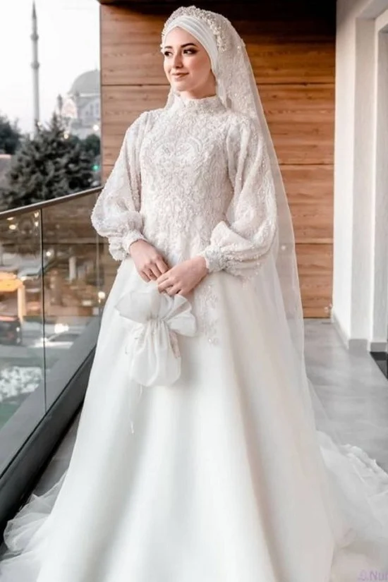إذا كُنت ترغبين في إطلالة كالملكات في يومك المميز، يمكنك ارتداء فستان الحرير الواسع الذي يعتبر جزءًا من مجموعة فساتين الأعراس للمحجبات، صُمم هذا الفستان من الحرير الأبيض الرقيق بتصميم هادئ وأنيق، ويمكنك اختيار تطريز الدانتيل الهادئ لإضافة لمسة جمالية إلى الفستان، يتميز التصميم بأكمام طويلة ومنفوخة من الكتف، وقصة ضيقة في الوسط، وتنورة واسعة ومنفوشة تصل إلى الأرض بشكل أنيق، ويمكن تنسيق الفستان مع حجاب شيفون طويل من نفس لون الفستان وبوكيه ورد يدويًا.