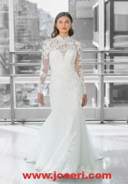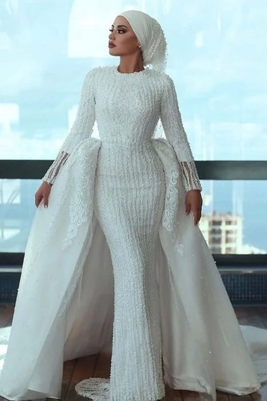 أحد أروع تصاميم الفساتين لحفل الزفاف للعرائس المحجبات هو الفستان ذو القصة المستقيمة، المصنوع من أقمشة فاخرة ومتقنة، تم تصميم هذه الفساتين لمساعدة العرائس المحجبات على الظهور بإطلالة ساحرة، حيث تتميز هذه التصاميم بالأكمام الضيقة والطويلة، التي تزدان بتطريز فاخر في الأطراف وتتميز بشكل دائري حول الرقبة، الفستان مميز أيضًا بالصدر المغلق والبورد الكبير الذي يمتد من الأكتاف إلى الوسط، وتنتهي التصاميم بتنورة طويلة ومستقيمة تصل إلى الأرض، متوسطة الوسع، ويتم تنسيقها مع اللفة البيضاء من نفس لون القماش والبوكيه الأبيض.