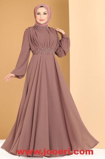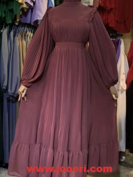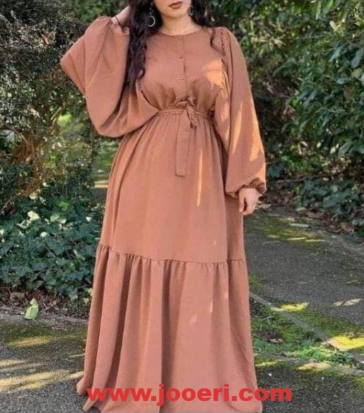 اللون الكشمير الداكن يعد من أكثرالألوان تميزًا والتي تميل إليه العديد من النساء وخاصةً الشابات، وهذا الفستان يأتي بستايل الكلوش في أغلب تصميمه من منطقة منتصف الصدر وحتى قبل نهايته في الأسفل، ويقطع الكلوش في أسفله كورنيشة أفقية أما الأكمام فهي واسعة بكلوش أفقي.