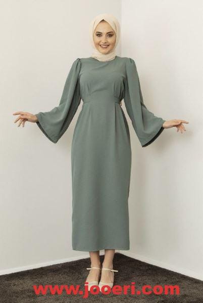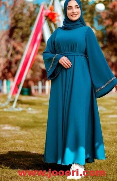 اللون البترولي يعتبر من أفضل الألوان على الإطلاق وتصميم هذا الفستان هنا سادة بالكامل محدد بحزام في الوسط، وعلى الأكمام يوجد شريط أفقي من التطريز اللامع الذي يعطي جاذبية كبيرة للتصميم ككل.