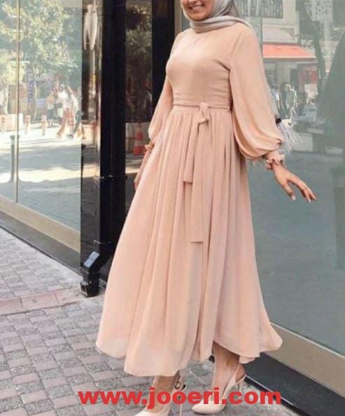 هذا اللون هو أحد درجات اللون السيمون الذي يعتبر من الألوان الرقيقة والهادئة والأنيقة جدًا، وتصميم الفستان هنا بسيط تمامًا فهو يخلو كليًا من أي نقوش أو تفاصيل مبالغ فيها، فهو يتضمن كورنيشة أفقية عند منطقة الركبة والوسط محدد بحزام أما الأكمام فهي واسعة ومحددة من عند المعصم بأساور.