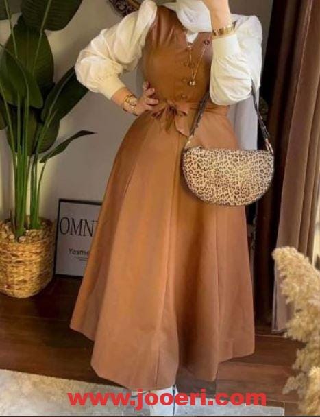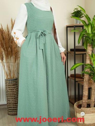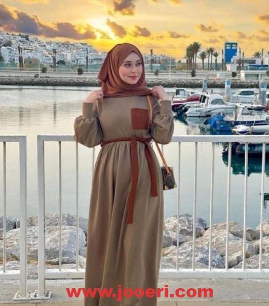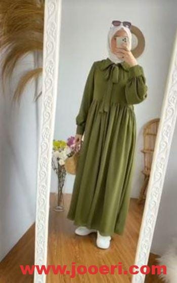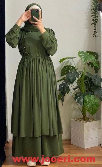 هذا الفستان الجميل باللون الزيتي ويتكون من قطعتين الأولى جيبة سفلية والثانية إدناء علوي بأكمام طويلة، ويتميز بكونه محتشمًا وفضفاضًا ولتصميمه المميز يتيح إمكانية الاستغناء عن حزام الوسط.