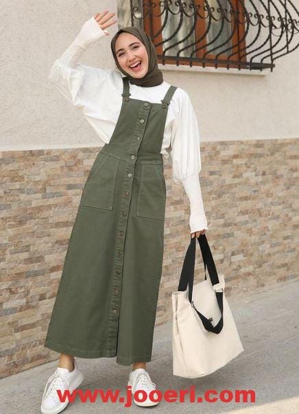هذا الفستان يأخذ شكل السالوبيت وهو باللون الزيتي مصنوعة من قماش الجبردين، وأسفلها شيميز أبيض سادة واسع المقاس حتى منطقة الكوع وحتى نهايته عند المعصم مجسم.
